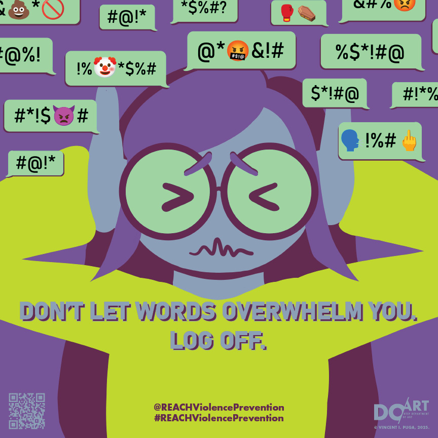 These student designs were created for the REACH Violence Prevention Campaign Against Cyberbullying / Promoting Online Kindness. REACH (Resilience, Education, Action, Community, and Humanity) is a community-based initiative funded by the Department of Homeland Security that aims at preventing targeted violence. As part of the initiative, the class participated in creating anti-cyberbullying posters promoting online kindness that REACH then used for their social media campaigns.