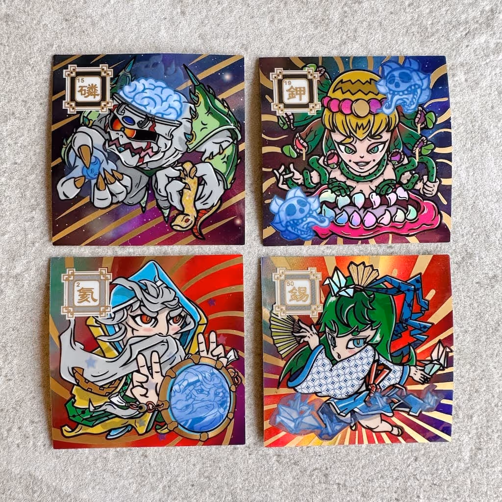 Each character is based on real chemical properties. Hydrogen has three siblings representing its isotopes. Sulfur is an explosives expert. Iodine helps the Diamond Army block radioactive attacks. Phosphorus even features a heat-sensitive blue flame in its sticker design.