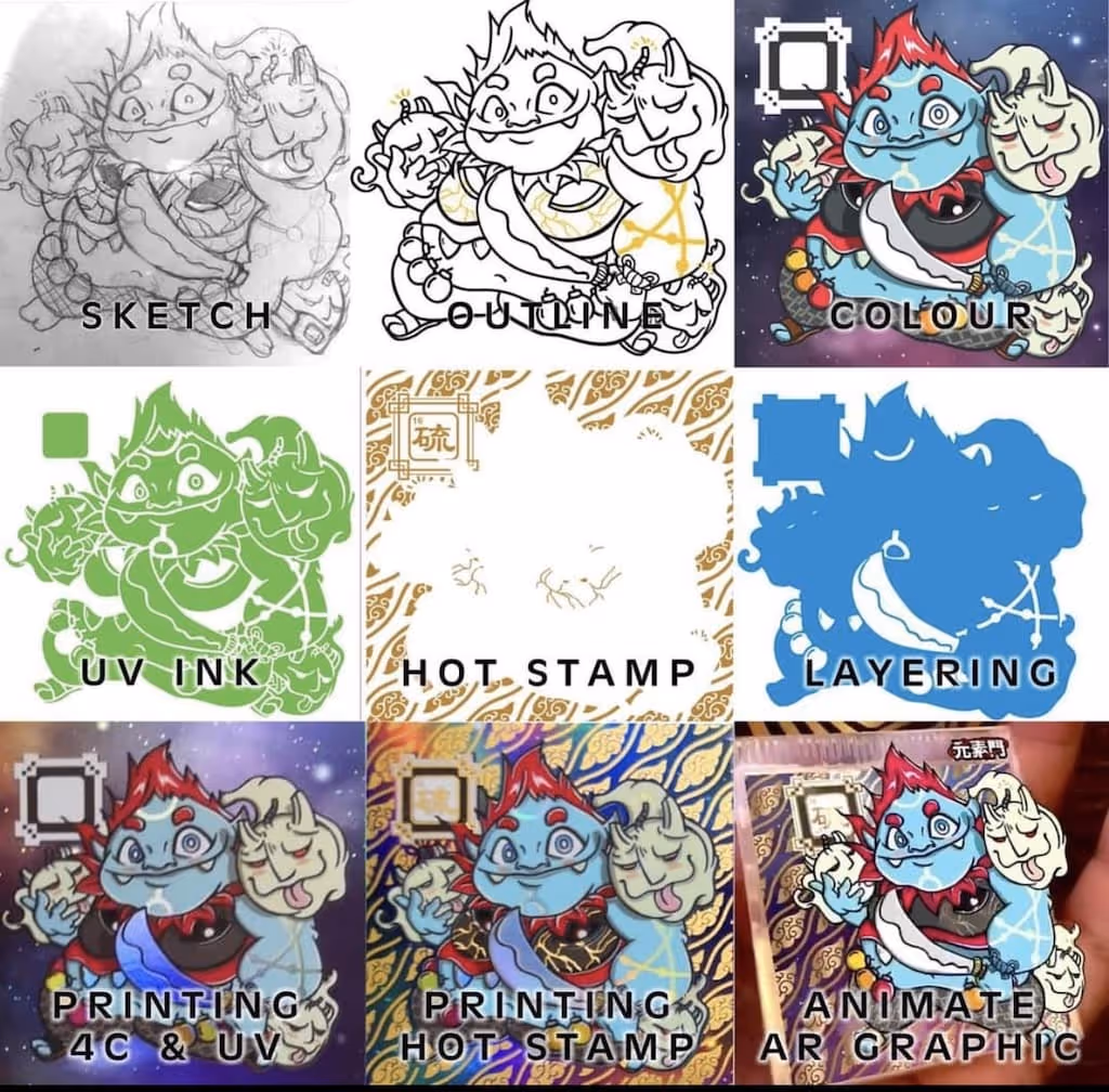 Every sticker is printed using multiple layers, holographic bases, white ink, glossy coating, metallic foiling, even lenticular and heat-sensitive effects, to replicate the craftsmanship of 80s collectibles.